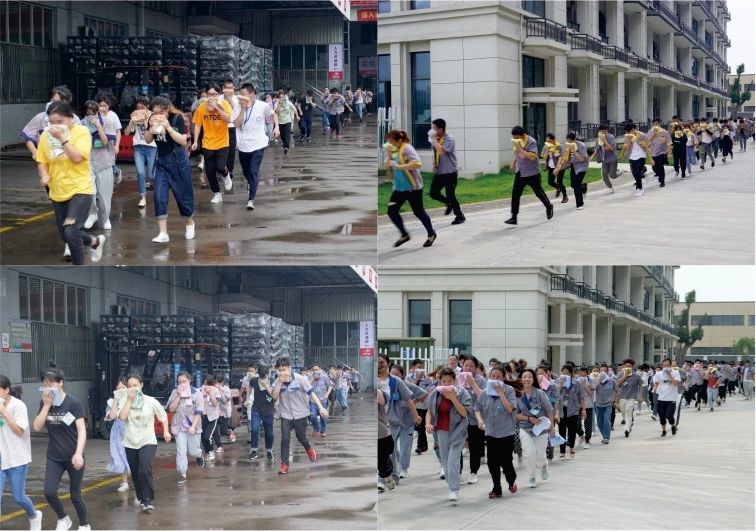 全體員工聽到火災報警鈴聲后,立即關(guān)閉整幢樓電源,各小組在各自指揮員的組織下,快速按照消防預案的疏散線路有序彎腰小步快跑,并用毛巾捂住口鼻,緊急有序的疏散到集合的指定區(qū)域。全員到達目的地后,維護人員立馬整隊并核查人數(shù),計數(shù)人員向活動總指揮報告人數(shù)和撤離情況,總指揮宣布演練結(jié)果。